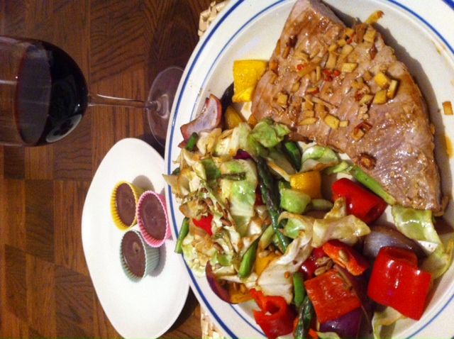 My boyfriend is off on a boys weekend so I’ve made myself a saturday night treat – pan fried tuna steak with chilli, ginger & garlic, some homemade chocolates made from raw cacao and a cheeky little glass of red wine to top it off – yum!